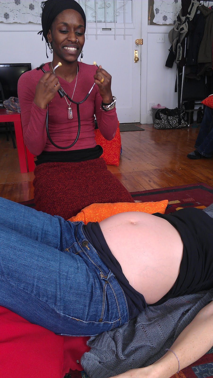 Note: For anyone who finds themselves all freaked out at the sight of doulas feeling bellies and listening with a fetal heart finding device, have no fear and relax. We are not out to do midwives’ jobs (otherwise we’d go out and be midwives), nor are we trying to assume any clinical care of our clients. My students are literally under contractual obligation to perform NO diagnostic skills on their clients. We nourish the whole and provide information and support. We like to promote optimal fetal positioning. There is a lot of controversy as to whether or not there is value to this, as many babies turn posterior during birth..but because of the fact we see a large percentage of natural births, we also see (as anecdotal as it may be) that many of these malpositions during labour occur after mothers receive an epidural. We know that for moms who have healthy, normal pregnancies and their babies are determined by their caregivers to be head down and stable, the principles of OFP may potentially contribute to a smoother birth. Can we tell where babies are lying in their mom’s tummies? No, of course not, that takes years of midwifery/medicine experience. We ask Moms when we are asked if we know where their babies might be upon our discussions of OFP, “Where do YOU think your baby is?” We ask where the mom feels kicks and a bum, and if she wishes, we feel along with her. It is in the spirit of bonding, exploration, and empowerment,and helps moms get accustomed to our touch, establishing a deeper rapport that we bring to her birth experience. To validate to Mom that her instincts were right on, or to perhaps explore further if she is unsure, we invite her to listen to her baby’s heart, having her place the device over where she thinks Baby’s heart would be heard. Parents love to listen to this, and their eyes light up when they realize they figured out the mystery. Never is anyone listening to the heart rate for any diagnostic reasons, nor are doulas ever trying to diagnose position or lie. If nobody hears a heartrate, we know it’s because none of us know enough to find the right spot, no big deal. When parents ask about their baby’s positions, most doctors tend to consult the ultrasound papers and say, “it’s head down” and that’s that. So discussions about fetal positions and their being proactive about it piques their curiosity to know more about their bodies.