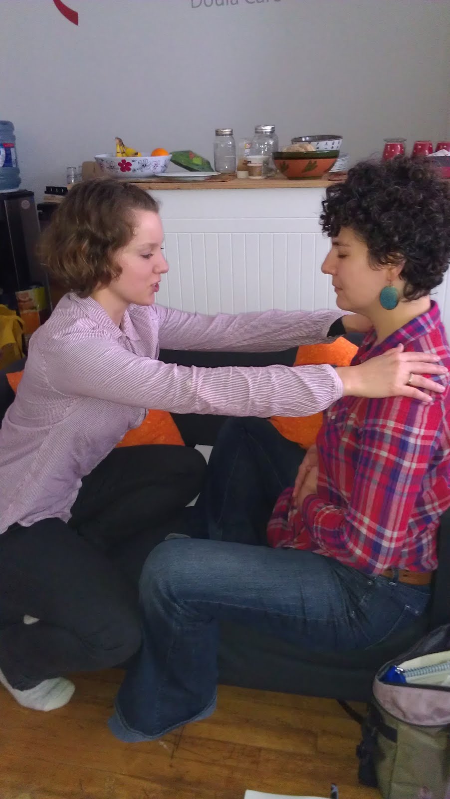 Doulas are very intimate with their clients’ bodies, massaging them throughout labour, drying them off when they’re getting out the shower and are too busy with their labours to do so, dangling them on our laps to help bring Baby down, suddenly seeing a baby’s head in her vaginal opening and yelling for a doctor, positioning their bodies to facilitate changes in position, drying tears, wiping blood off their legs, changing soiled bedding, holding vomit bowls, touching breasts, showing how to diaper and swaddle their babies, holding their babies when necessary….to put a taboo around a belly with a baby in it is a silly silly thing if this is our client’s desire. There is often the assumption that if you give a woman some knowledge she’ll go off and do dangerous things with it. Feeling bellies is not a “Gateway Touch” which shoots doulas over the line into playing midwife. The Spanish Inquisition ended a long time ago.